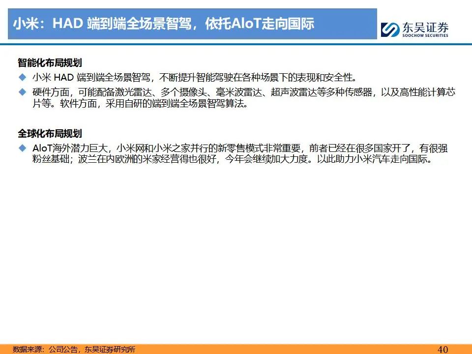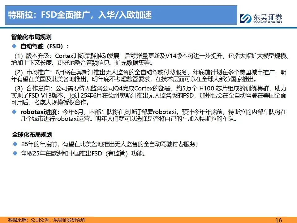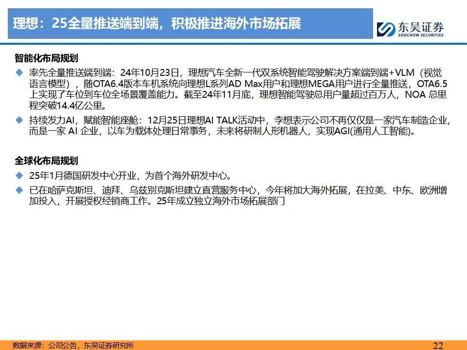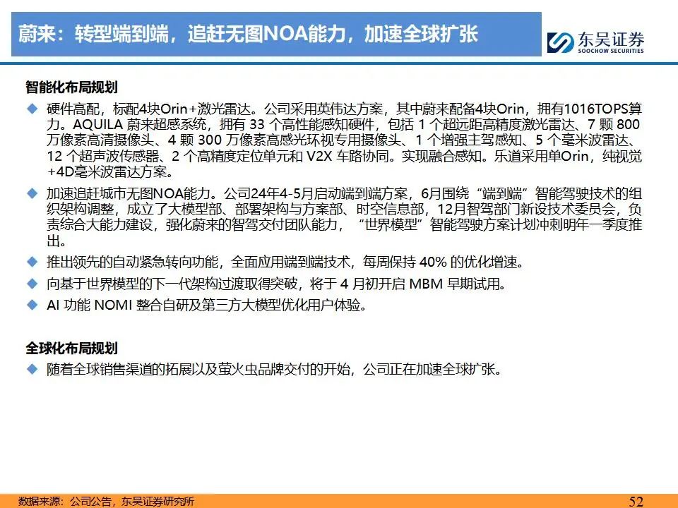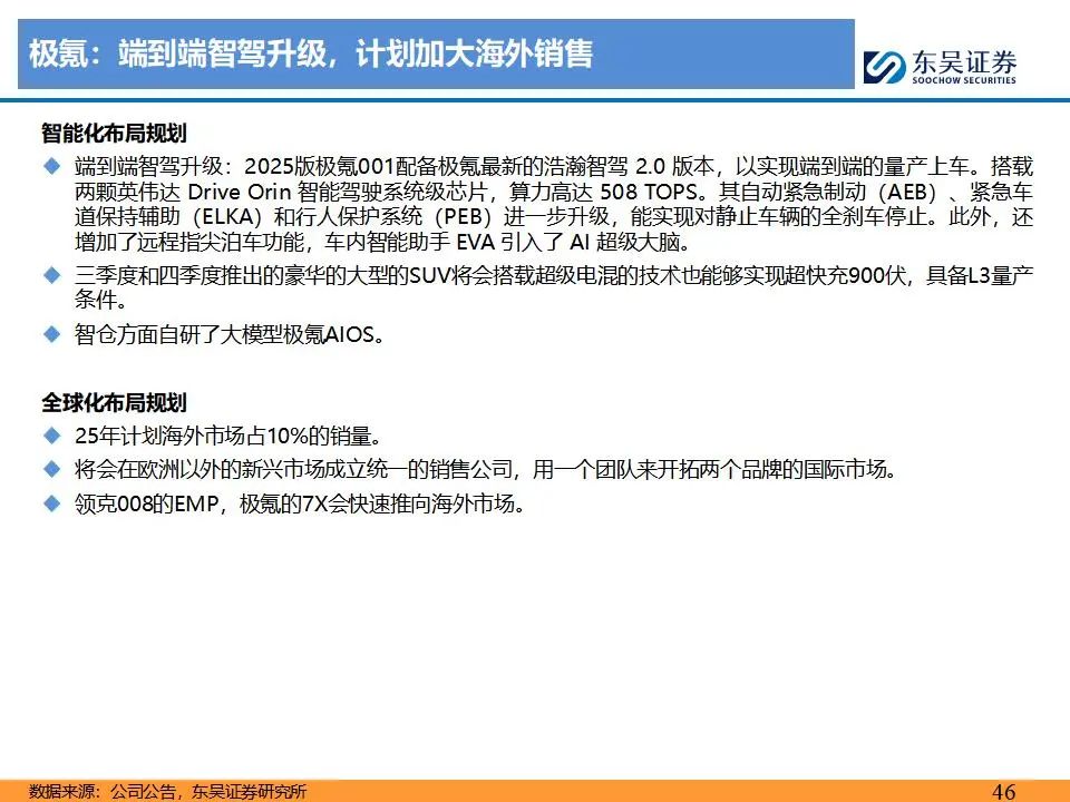 智能化和全球化是车企2025年两大战略。智驾方面,特斯拉FSD目标2025年进入欧洲和中国。新势力24年主要聚焦端对端、无图城市NOA的竞争,而25年更注重智驾平权、智驾下沉,小鹏MOAN03max版本将高阶智驾下沉至15万价格带,可使用城市NOA;零跑B10搭载激光雷达,4月可使用高速NOA,年底目标为使用城市NOA,价格下沉至10-12万。全球化方面,一方面加快海外销售网络建设和品牌宣传,其中小鹏目标25年海外销量翻番至4万辆,极氪集团目标出口销量占比10%;另一方面,新势力将加快智能化海外布局,包括数据收集、测试等。