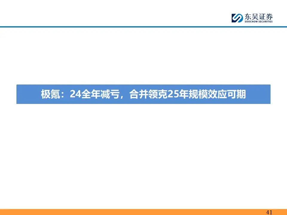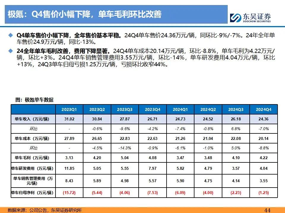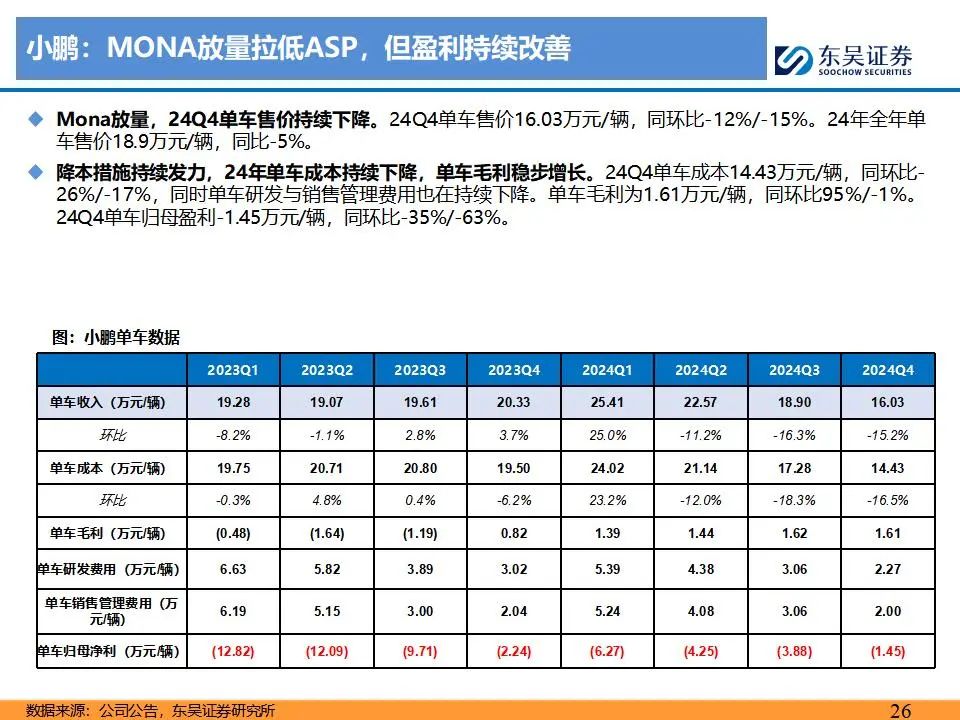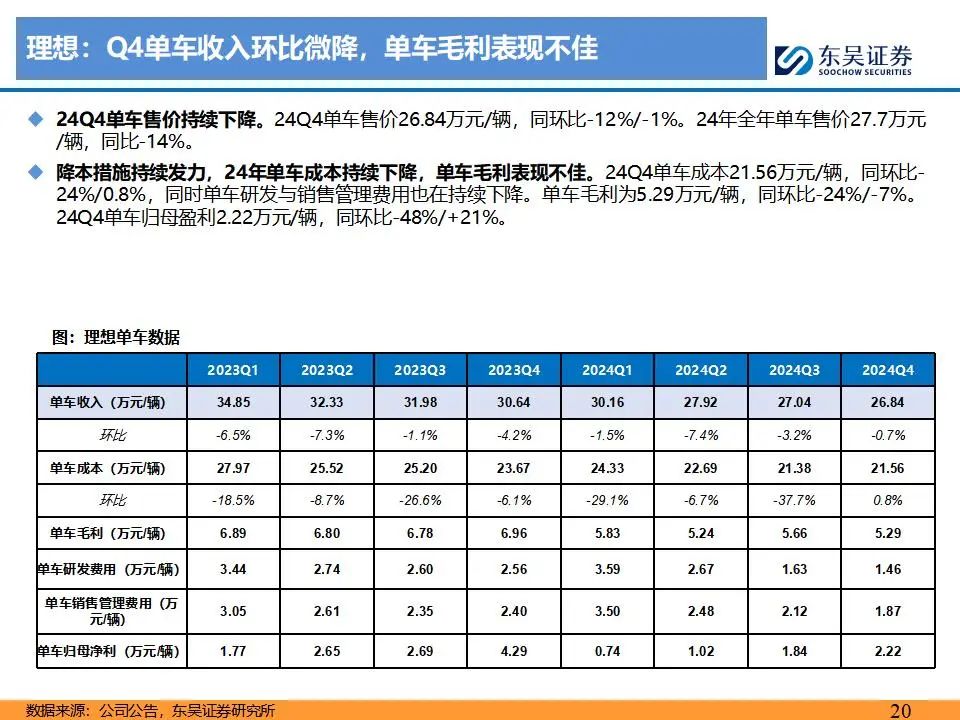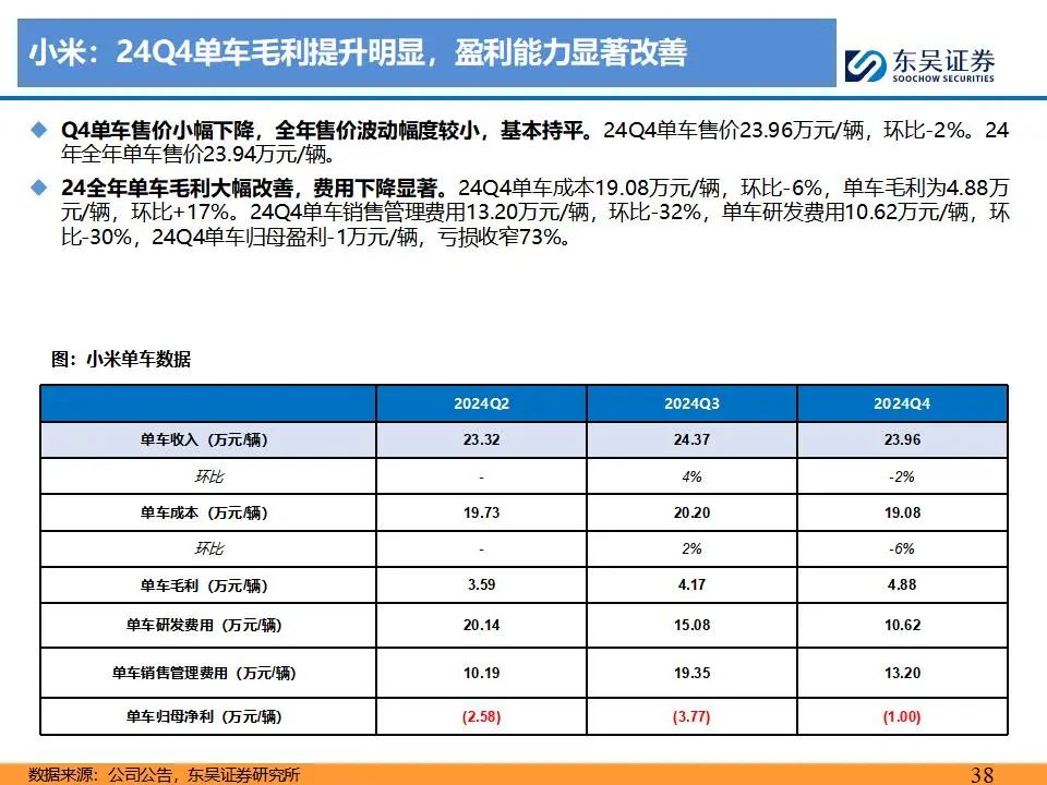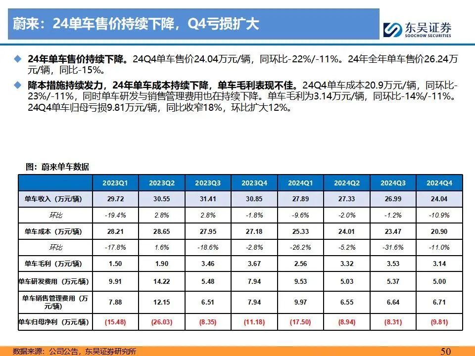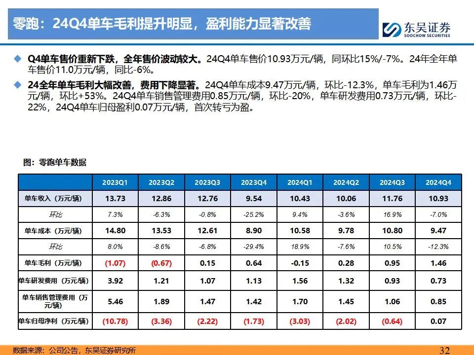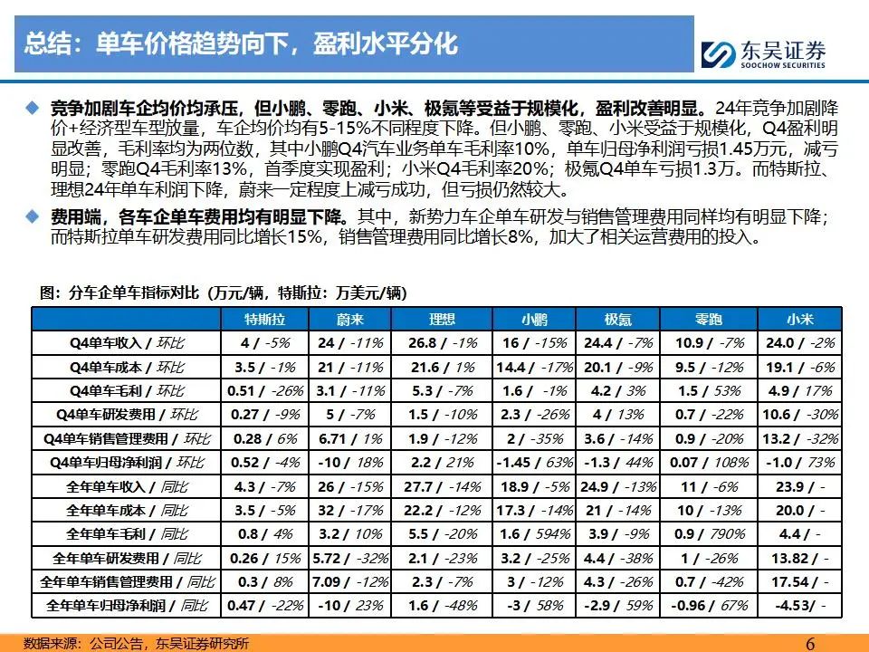竞争加剧车企均价均承压,但小鹏、零跑、小米、极氪等受益于规模化,盈利改善明显。24年竞争加剧降价+经济型车型放量,车企均价均有5-15%不同程度下降。但小鹏、零跑、小米受益于规模化,Q4盈利明显改善,毛利率均为两位数,其中小鹏Q4总体业务毛利率14.4%,单车亏损1.45万元,减亏明显;零跑Q4毛利率13%,首季度实现盈利;小米Q4毛利率20%;极氪Q4单车亏损1.3万元。而特斯拉、理想24年单车利润下降,蔚来单车亏损10万,幅度仍较大。