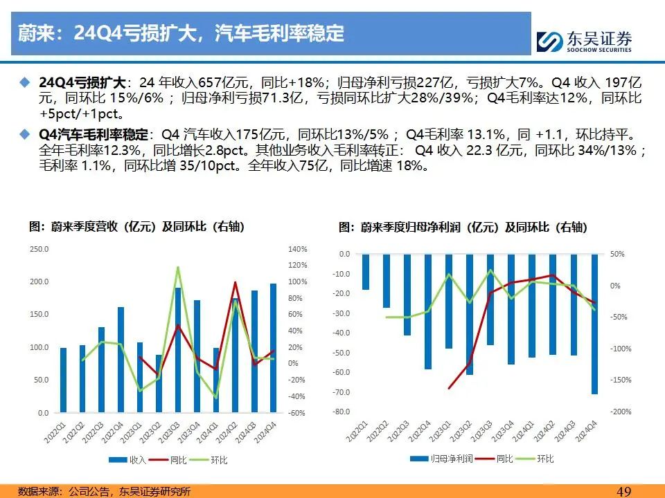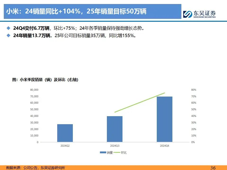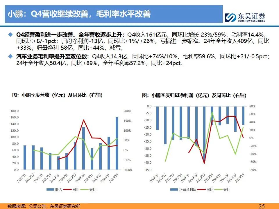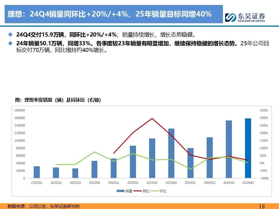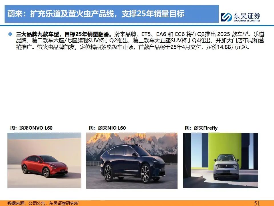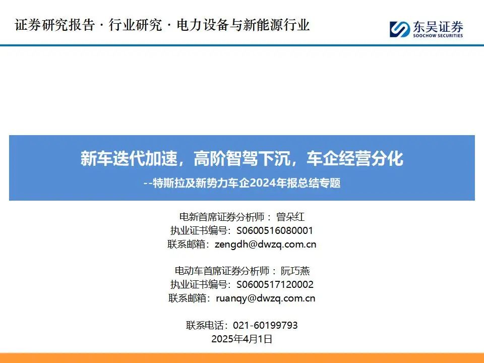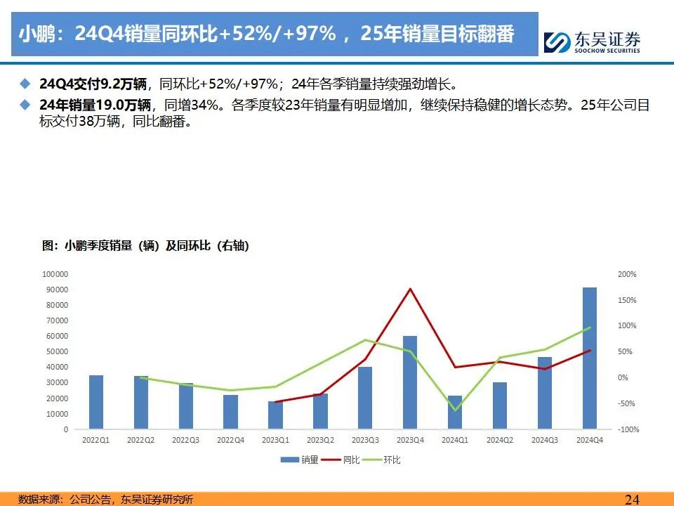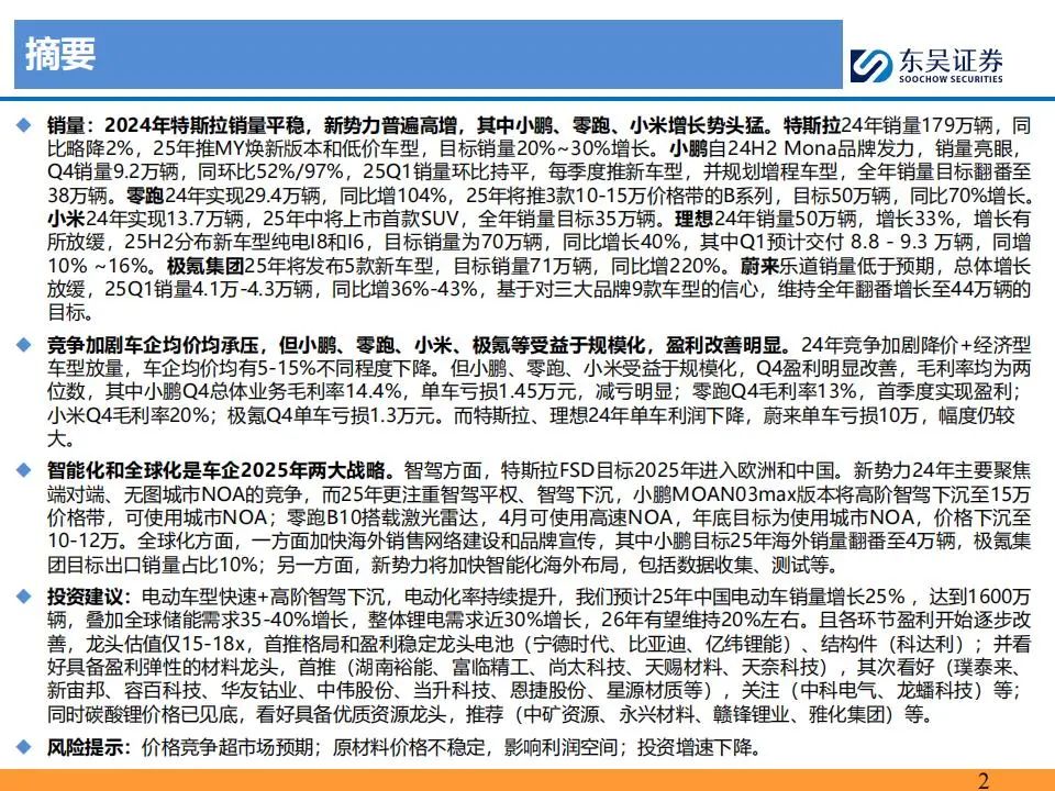 销量:2024年特斯拉销量平稳,新势力普遍高增,其中小鹏、零跑、小米增长势头猛。特斯拉24年销量179万辆,同比略降2%,25年推MY焕新版本和低价车型,目标销量20%~30%增长。小鹏自24H2 Mona品牌发力,销量亮眼,Q4销量9.2万辆,同环比52%/97%,25Q1销量环比持平,每季度推新车型,并规划增程车型,全年销量目标翻番至38万辆。零跑24年实现29.4万辆,同比增104%,25年将推3款10-15万价格带的B系列,目标50万辆,同比70%增长。小米24年实现13.7万辆,25年中将上市首款SUV,全年销量目标35万辆。理想24年销量50万辆,增长33%,增长有所放缓,25H2分布新车型纯电I8和I6,目标销量为70万辆,同比增长40%,其中Q1预计交付 8.8 - 9.3 万辆,同增 10% ~16%。极氪集团25年将发布5款新车型,目标销量71万辆,同比增220%。蔚来乐道销量低于预期,总体增长放缓,25Q1销量4.1万-4.3万辆,同比增36%-43%,基于对三大品牌9款车型的信心,维持全年翻番增长至44万辆的目标。