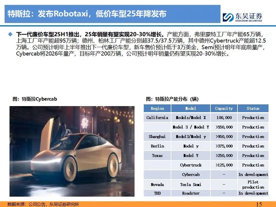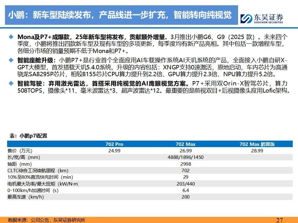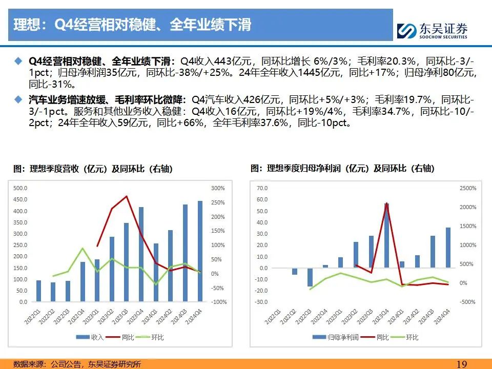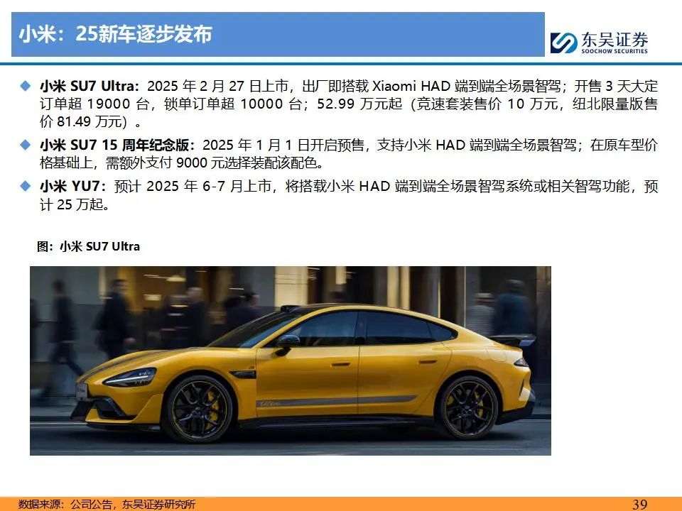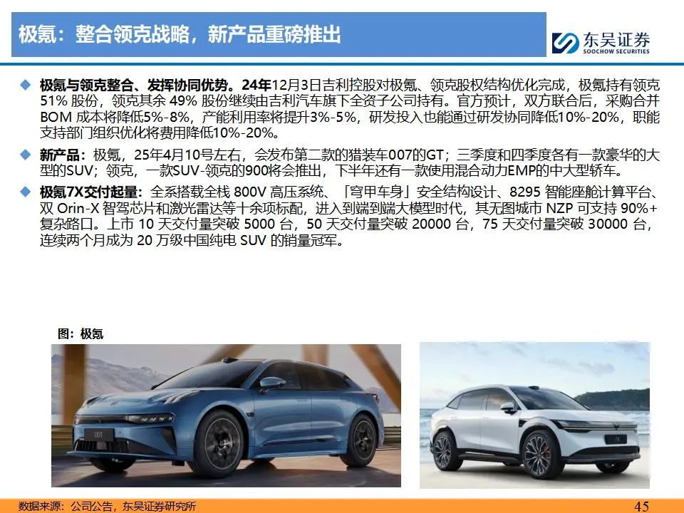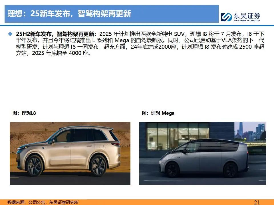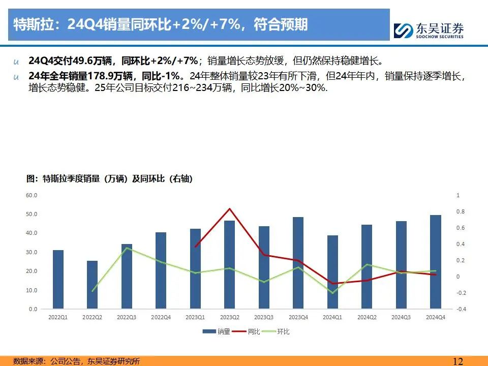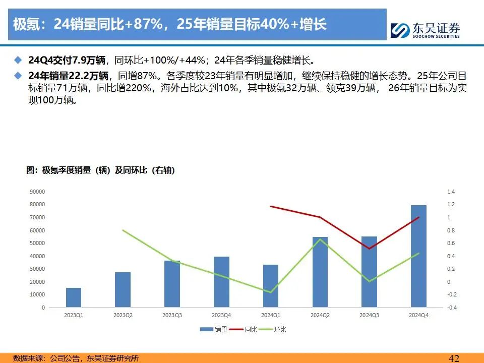 销量:2024年特斯拉销量平稳,新势力普遍高增,其中小鹏、零跑、小米增长势头猛。特斯拉24年销量179万辆,同比略降2%,25年推MY焕新版本和低价车型,目标销量20%~30%增长。小鹏自24H2 Mona品牌发力,销量亮眼,Q4销量9.2万辆,同环比52%/97%,25Q1销量环比持平,每季度推新车型,并规划增程车型,全年销量目标翻番至38万辆。零跑24年实现29.4万辆,同比增104%,25年将推3款10-15万价格带的B系列,目标50万辆,同比70%增长。小米24年实现13.7万辆,25年中将上市首款SUV,全年销量目标35万辆。理想24年销量50万辆,增长33%,增长有所放缓,25H2分布新车型纯电I8和I6,目标销量为70万辆,同比增长40%,其中Q1预计交付 8.8 - 9.3 万辆,同增 10% ~16%。极氪集团25年将发布5款新车型,目标销量71万辆,同比增220%。蔚来乐道销量低于预期,总体增长放缓,25Q1销量4.1万-4.3万辆,同比增36%-43%,基于对三大品牌9款车型的信心,维持全年翻番增长至44万辆的目标。