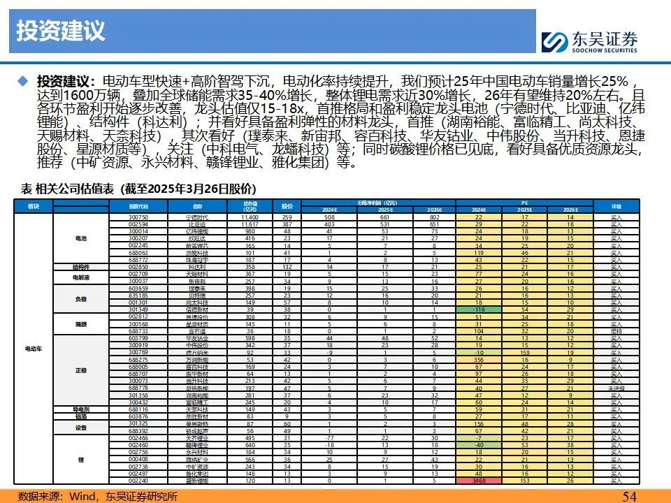 投资建议:电动车型快速+高阶智驾下沉,电动化率持续提升,我们预计25年中国电动车销量增长25% ,达到1600万辆,叠加全球储能需求35-40%增长,整体锂电需求近30%增长,26年有望维持20%左右。且各环节盈利开始逐步改善,龙头估值仅15-18x,首推格局和盈利稳定龙头电池(宁德时代、比亚迪、亿纬锂能(维权))、结构件(科达利);并看好具备盈利弹性的材料龙头,首推(湖南裕能、富临精工、尚太科技、天赐材料、天奈科技),其次看好(璞泰来、新宙邦、容百科技、华友钴业、中伟股份、当升科技、恩捷股份、星源材质等),关注(中科电气、龙蟠科技)等;同时碳酸锂价格已见底,看好具备优质资源龙头,推荐(中矿资源、永兴材料、赣锋锂业、雅化集团)等。