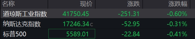 道指跌0.60%,纳指跌0.31%,标普500指数跌0.41%。特斯拉涨逾1%,强生跌超3%。纳斯达克中国金龙指数涨0.54%,小鹏汽车涨超3%,理想汽车涨超1%。