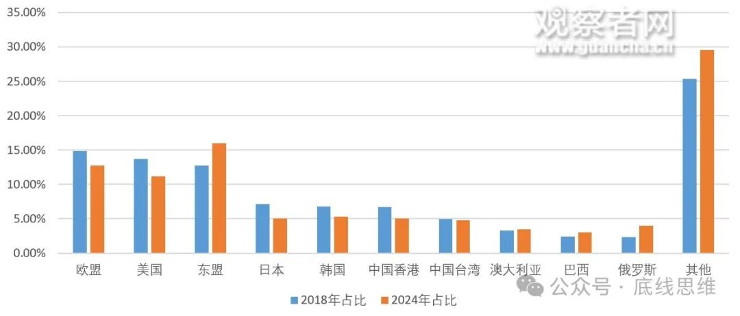 截至2024年,在中国的双边贸易中,东盟和金砖国家的合计占比已超过欧美约7个百分点。美国的贸易战,反而正在“帮助”中国加速重构世界经济新秩序。图表来源:作者自制。
