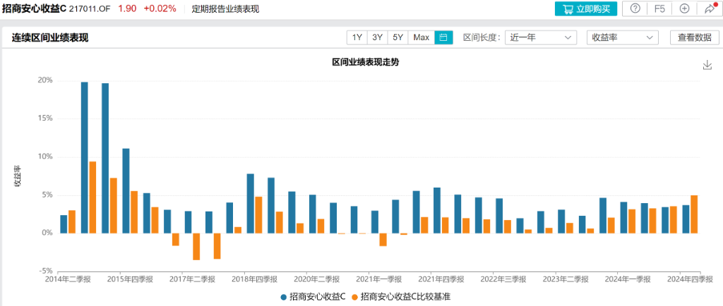 另外,以年计算,马龙管理的安心收益C基金,曾经在任期内实现了“年年正收益”。包括业绩比较基准出现负收益的年份。