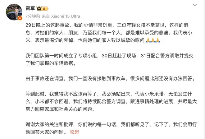 29日晚上的这起事故,我的心情非常沉重。三位年轻女孩不幸离世,这样的消息,对她们的家人、朋友,乃至我们每一个人,都是难以承受的悲痛。我代表小米,表示最深切的哀悼,也向她们的家人致以诚挚的慰问 ???