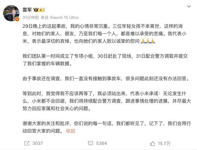 雷军在社交媒体发文称,29日晚的事故让他心情极为沉重。三位年轻女孩不幸离世,这对其家人、朋友乃至每个人而言都是难以承受之痛。他代表小米表达最深切哀悼,并向家属致以诚挚慰问。