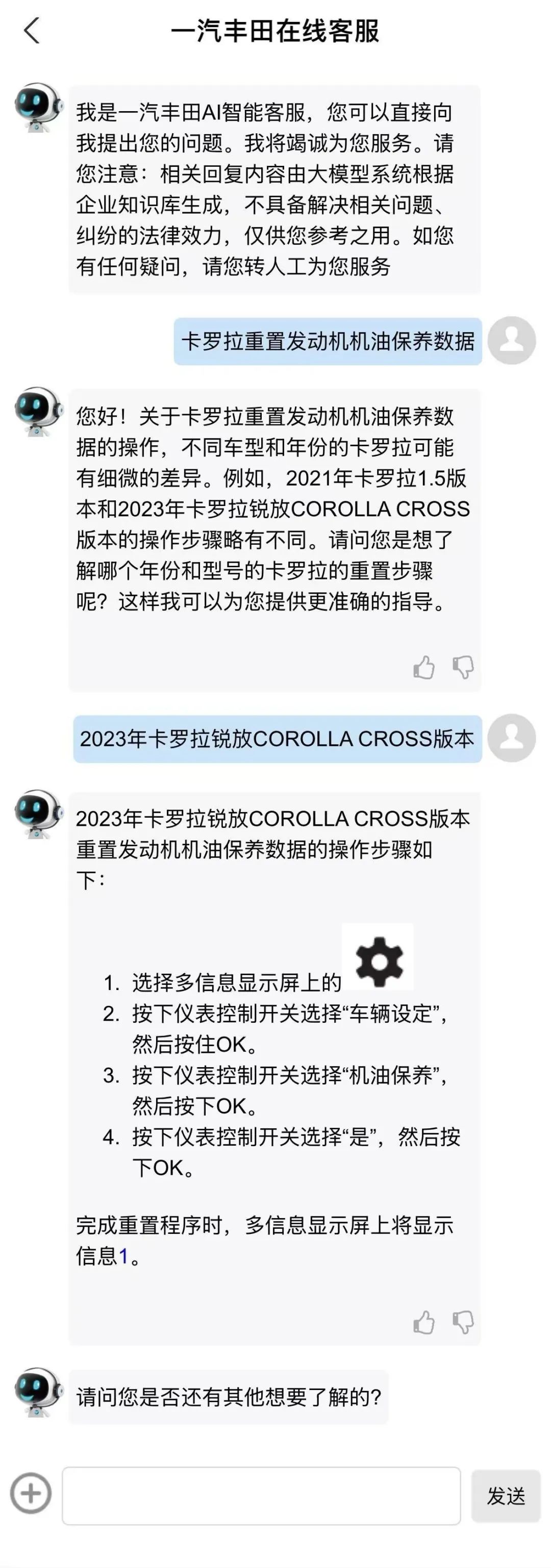 智能客服能够深入理解一汽丰田自身的产品信息、服务流程、业务规则,不再「答非所问」,回答更贴合业务实际;