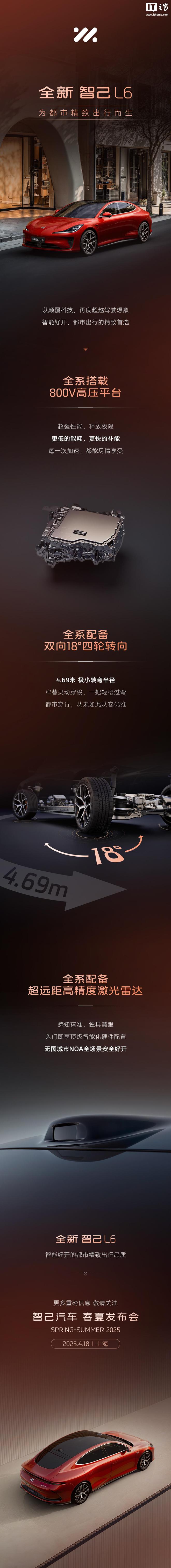 IT之家 4 月 3 日消息,全新智己 L6 纯电轿车将于 4 月 18 日正式发布,该车将推出全新车色马蒂斯红,并有望进一步降低售价。作为参考,现款智己 L6 售价区间为 21.99-34.59 万元,限时售价 18.99 万起。