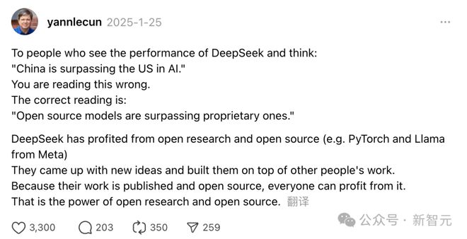 直到「DeepSeek轰动全球时」,Yann LeCun才表达了DeepSeek胜利真正证明的是「开源模型模型将要超过专有模型」。