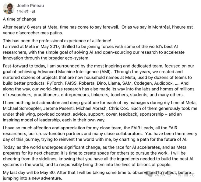 Pineau在博客中说「随着世界经历重大变化,随着AI竞赛的加速,随着Meta为下一章做准备,是时候为其他人创造工作空间了」。