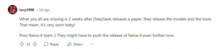 有海外论坛网友调侃道,DeepSeek一贯是“论文后发模型”的节奏,竞争对手Llama-4可能因此受压。