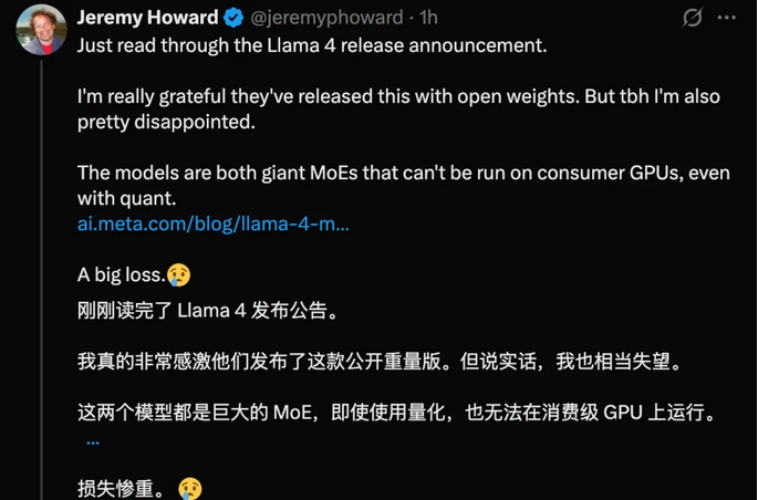 前kaggle总裁,fast AI 创始人Jeremy Howard表示,虽然感谢开源,但Llama 4 Scout 和 Maverick 都是大型 MoE 模型,即使量化后也无法在消费级 GPU 上运行,这对开源社区的可及性来说是个不小的损失