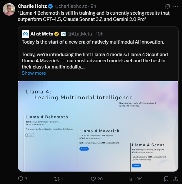 有X网友指出了Behemoth训练的性能潜力,强调了它在阶段就已经表现出超越多个最高级模型的能力,例如Claude 3.7 和Gemini 2.0 Pro。