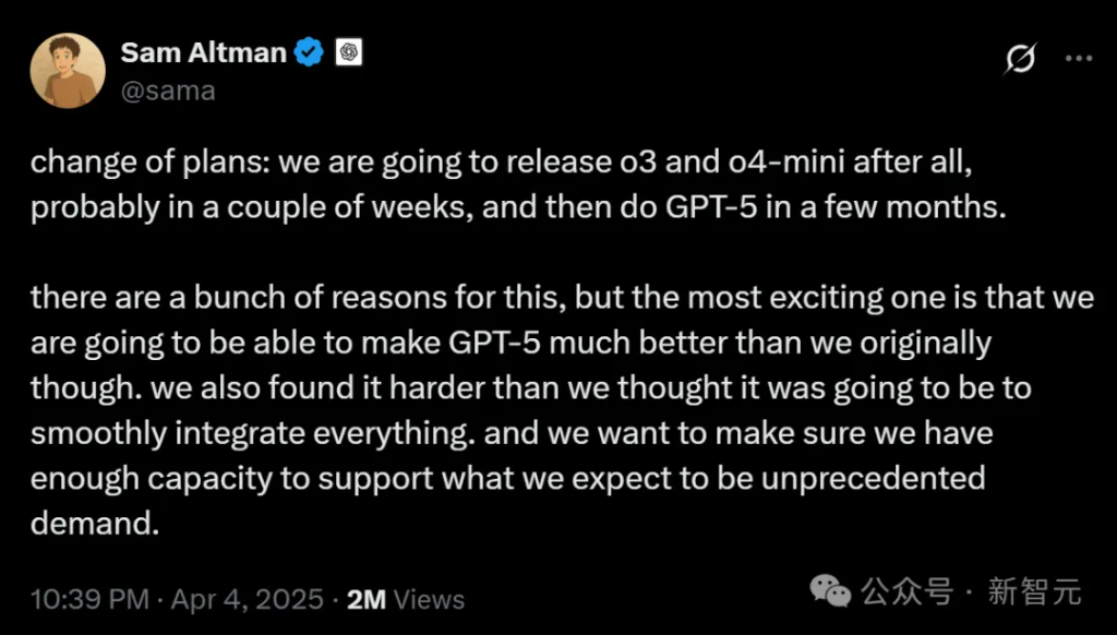 在Llama 4发布的同时,OpenAI首席执行官Sam Altman则在社交媒体上确认,O3和O4-mini将在未来几周内发布,而GPT-5则将在未来几个月与公众见面。