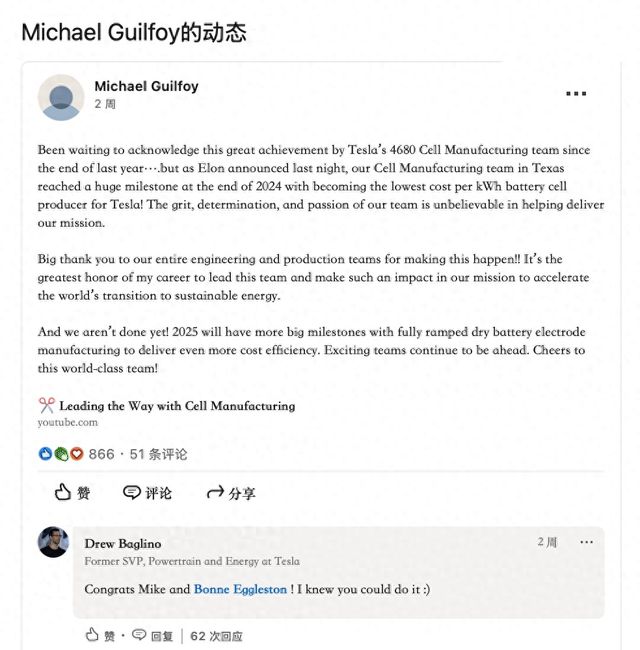 【环球网科技综合报道】4月7日消息,特斯拉在2025年第一季度内部会议上宣布了一项重要进展:其自家的4680电池生产线在成本效益方面已经超越了外部供应商。特斯拉德州超级工厂的电池制造主管Michael Guilfoy在领英上表示,得州电池制造团队已经成功成为特斯拉每千瓦时成本最低的电池单体生产者,这一成就不仅得益于特斯拉先进的生产技术和工艺。
