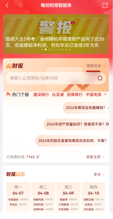 记者经由每经App进入“财报智能体”模块发现,每经财报智能体涵盖了AI财报、财报日历、财报视解、深度财报等功能。