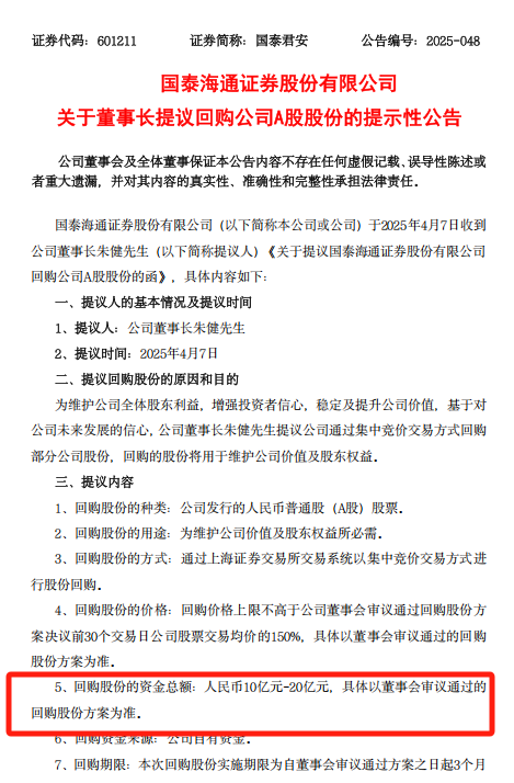 此外,作为新近完成合并的国泰海通也有积极动作,公司董事长朱健提议10亿至20亿回购,一季度业绩激增3.5倍至4倍。