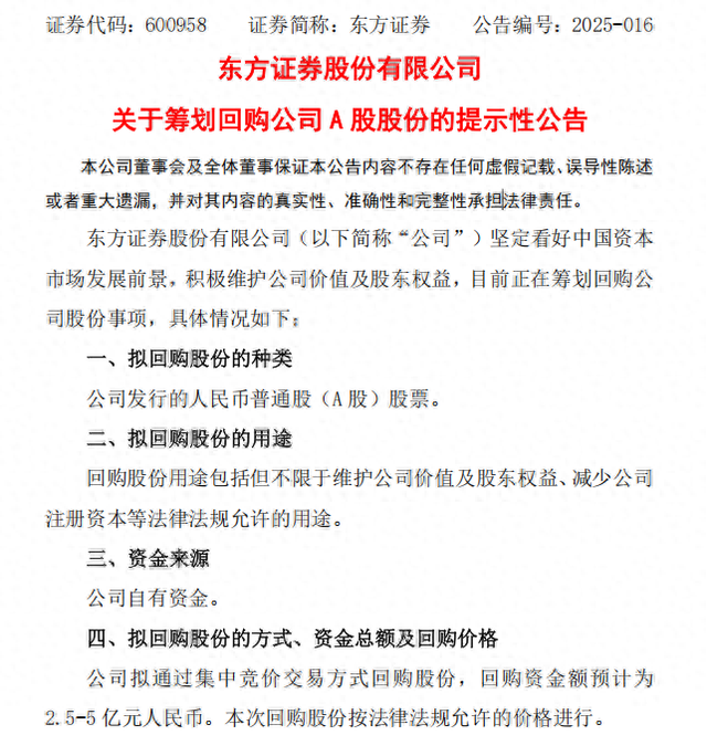 当日盘前,东方证券发布公告,公司坚定看好中国资本市场发展前景,积极维护公司价值及股东权益,公司拟以2.5亿元至5亿元资金回购公司A股股份,回购价格不超过每股12元。