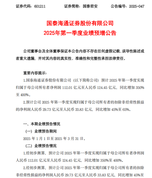 国泰海通公告称,预计2025年第一季度实现归属于母公司所有者净利润112.01亿元至124.45亿元,同比增加350%至400%;预计公司2025年第一季度实现归属于母公司所有者的扣除非经常性损益的净利润29.73亿元至33.83亿元,同比增加45%至65%。