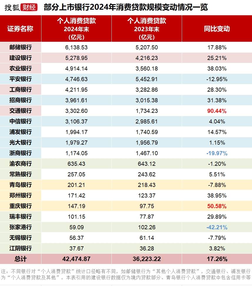 搜狐财经统计数据显示,2024年度,20家已披露消费贷最新数据的上市银行共发放消费贷款4.25万亿元,较2023年末增长6251.65亿元、增幅17.26%。其中,10家上市银行增速超过10%,交行、农行、建行年增量超过千亿元;平安银行等6家银行消费贷规模收窄。
