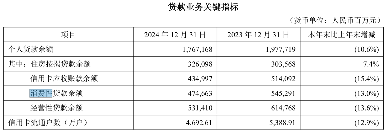 统计数据显示,消费贷款规模在3000亿元以上的银行中,平安银行为唯一一家消费贷规模收缩的机构。截至2024年末,平安银行消费性贷款余额较上年末减少13.0%至4746.63亿元,降幅706.28亿元。