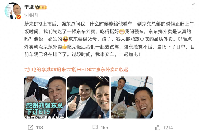 “蔚来ET9上市后,强东总问我,什么时候能给他看车,到京东总部的时候正赶上午饭时间,我们先吃了一顿京东外卖,吃得挺好。我问强东,京东搞外卖是认真的吗?他说,必须的,京东要做父母、孩子、客人都能放心吃的品质外卖。”李斌称。