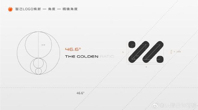 智己汽车的 LOGO 是中心轴对称图形,具有标准 45 度的视觉平衡美感,本次 LOGO 焕新设计,旨在提升品牌年轻向上的活力气息,予以向上增长的势能,同时结合黄金分割比例切线的精确校准,将双斜线元素的角度上抬确定在了 1.6 度,使整体角度来到 46.6 度的“黄金切角”,让 LOGO 拥有了更符合数理美学的视觉平衡感以及整体向上的视觉动势。