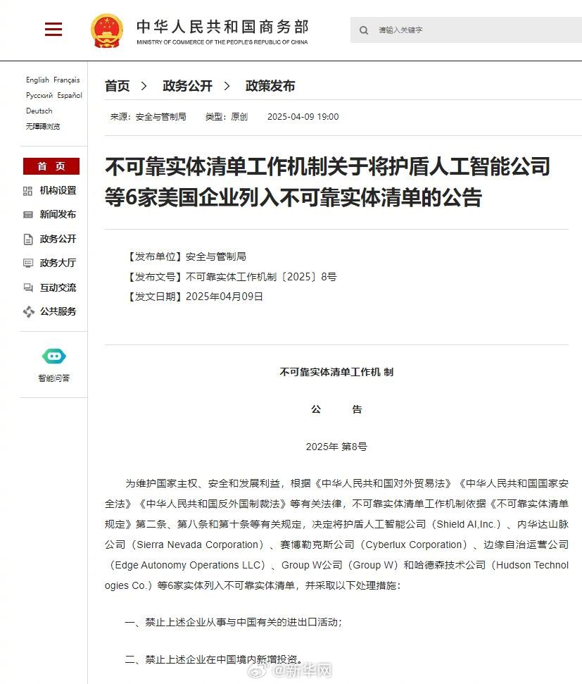 为维护国家主权、安全和发展利益,根据《中华人民共和国对外贸易法》《中华人民共和国国家安全法》《中华人民共和国反外国制裁法》等有关法律,不可靠实体清单工作机制依据《不可靠实体清单规定》第二条、第八条和第十条等有关规定,决定将护盾人工智能公司(Shield AI,Inc.)、内华达山脉公司(Sierra Nevada Corporation)、赛博勒克斯公司(Cyberlux Corporation)、边缘自治运营公司(Edge Autonomy Operations LLC)、Group W公司(Group W)和哈德森技术公司(Hudson Technologies Co.)等6家实体列入不可靠实体清单,并采取以下处理措施:
