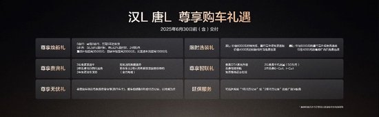 伴随汉L的上市,比亚迪王朝网还准备了七重购车礼遇。截至6月30日24:00前完成购车开票,用户可享尊享金融礼,0首付、0利息任选其一;尊享置换礼,置换补贴至高35000元;还有尊享无忧礼、尊享贵宾礼、尊享智联礼、延保服务可选。其中,尊享置换礼中除了至高20000元国补,更有首销期限时置换补贴10000元,同时比亚迪老车主额外可享5000元置换补贴加码!此外,用户额外可享限时选装礼,包括价值6000元的琉光银、墨竹青外观免费选装、价值4000元的绸锻棕内饰免费选装。尊享购车礼遇加持,进一步降低消费者的购车用车成本,让更多年轻用户畅享旗舰级出行体验。
