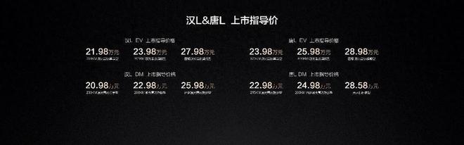 其中,汉L EV坐拥701KM激光雷达尊享型、701KM激光雷达旗舰型、四驱激光雷达旗舰型;汉L DM坐拥200KM激光雷达尊享型、200KM激光雷达旗舰型、四驱激光雷达旗舰型。新车提供4种外观颜色及2种内饰配色,售价为20.98万—27.98万元。