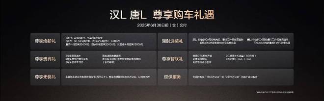 随着汉L的上市,比亚迪王朝网还准备了七重购车礼遇。截至6月30日24:00前完成购车开票,用户可享尊享金融礼,0首付、0利息任选其一;尊享置换礼,置换补贴至高35000元;还有尊享无忧礼、尊享贵宾礼、尊享智联礼、延保服务可选。其中,尊享置换礼中除了至高20000元国补,更有首销期限时置换补贴10000元,同时比亚迪老车主额外可享5000元置换补贴加码。此外,用户额外可享限时选装礼,包括价值6000元的琉光银、墨竹青外观免费选装、价值4000元的绸锻棕内饰免费选装。