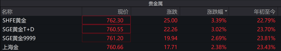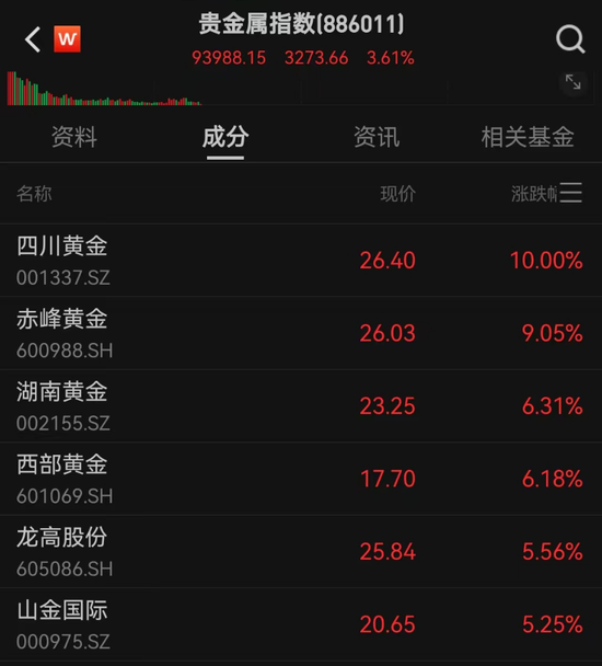 A股贵金属板块大涨,多股集体大涨。截至发稿,四川黄金涨停,赤峰黄金涨超9%,湖南黄金、西部黄金涨超6%,龙高股份、山金国际涨幅超5%。