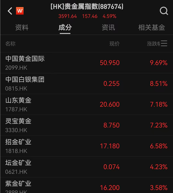 港股黄金股走强,截至发稿,中国黄金国际涨超9%,中国白银集团涨超8%,山东黄金涨超7%,灵宝黄金、招金矿业涨超6%,紫金矿业涨超3%。