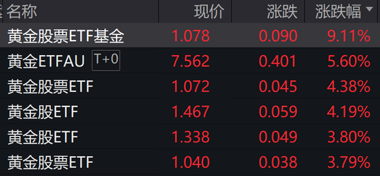 4月11日早盘,黄金相关ETF集体走强,多只黄金ETF涨超3%,黄金股票ETF基金涨幅超9%。