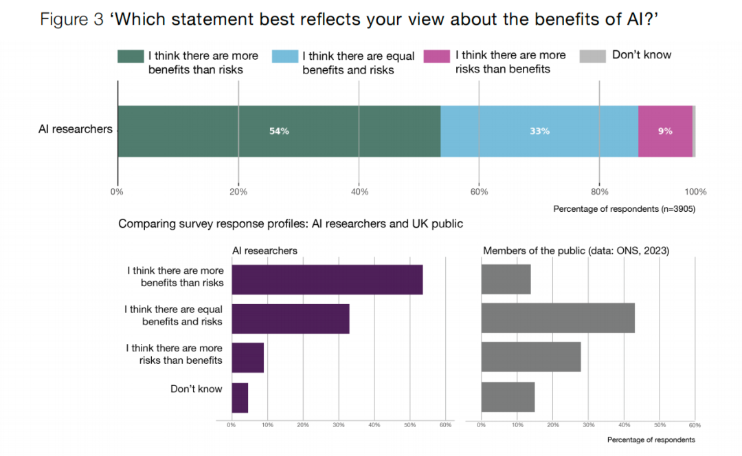 这份调研以预印本的形式发表在ZENODO上(https://zenodo.org/records/15118399),并将研究人员的答案与英国国家统计局2023年收集的英国公众的答案进行了比较。结果显示,在AI前沿工作的研究人员对AI的未来比公众更加乐观:54%的人认为AI将带来更多的益处而非风险,只有13%的英国公众持这种观点。