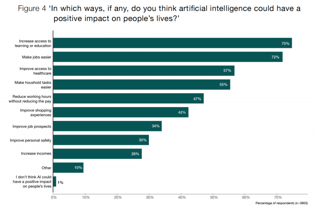 当问及人工智能具体在哪些方面改善我们生活时,75%的人认为可以增加学习或教育途径,72%的人认为可以使工作更加高效。