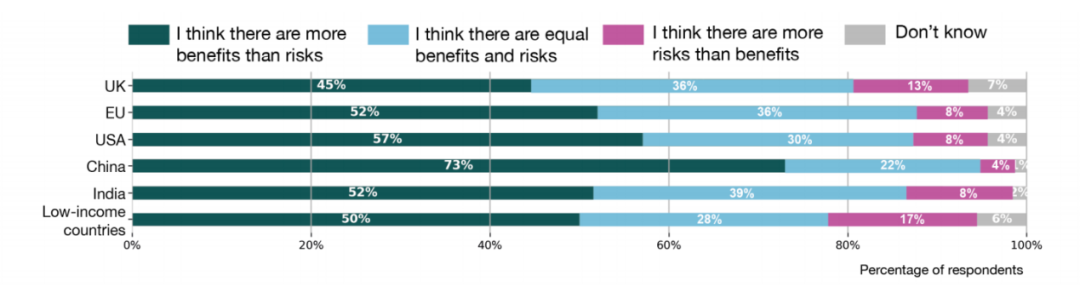 对比不同的国家,中国研究人员对AI的使用前景最为乐观,超过70%研究者认为,AI会给我们的生活带来更积极的影响,这一观点在美国的研究人员中占比不到60%,在英国只有45%。