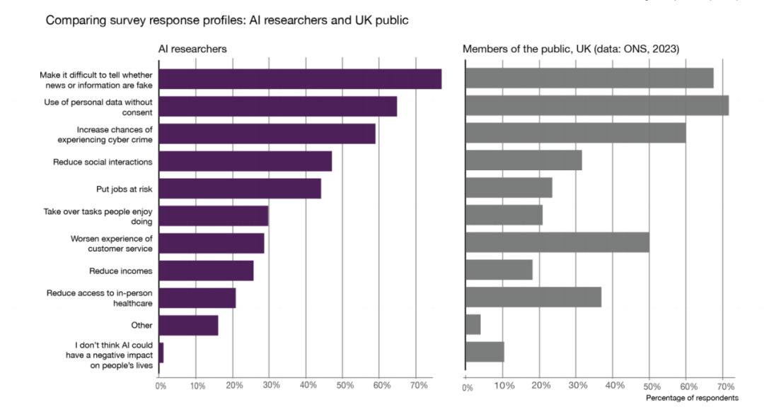 但与英国公众一样,研究人员同样对AI技术在虚假信息、数据使用和网络犯罪中的风险表示担忧。在调研中,77%的研究人员和68%的公众都表示,AI会让虚假信息更难识别;而65%的研究人员和71%的公众表示,科技公司未经同意使用人们的个人数据是一个问题。