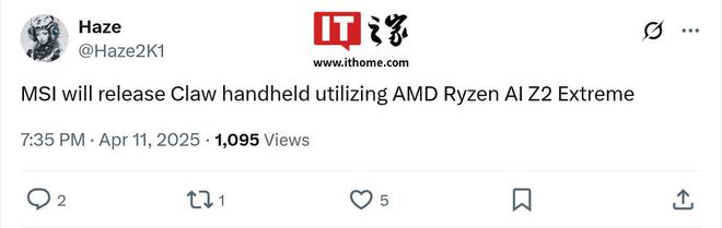IT之家 4 月 12 日消息,消息人士 Haze (@Haze2K1) 北京时间昨日宣称,微星将推出搭载 AMD 锐龙 AI Z2 Extreme 处理器的 Claw 游戏掌机设备。