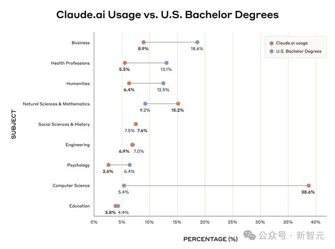 商科相关的对话在Claude.ai上仅占8.9%,而商科学位在美国学士学位中占比高达18.6%,可见Claude在商科领域的使用率较低。