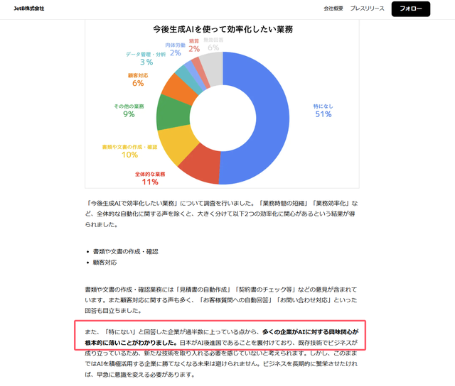 日本民间企业对AI的理解,可以从JetB的这项调查里看到:有51%的企业完全没有想到今后要用AI提升什么事务的效率。