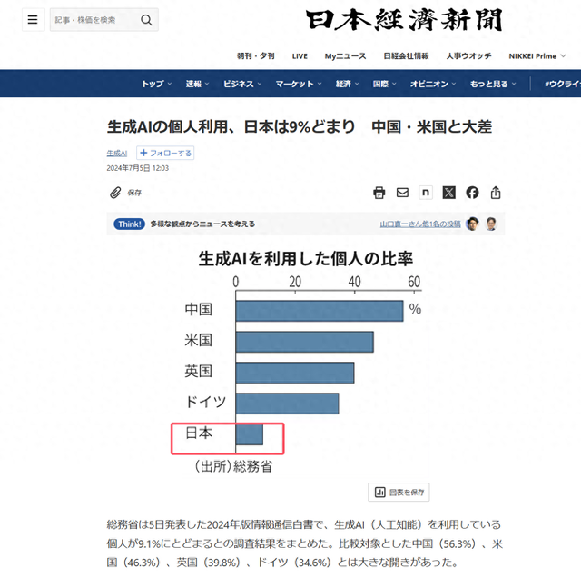 根据日本经济新闻的报道,日本正在使用生成式AI的人数,仅有9%,而中国已经接近60%大关,美国也超过了40%。