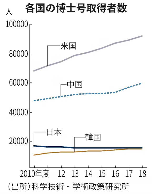 正是因为这样的场景需求,导致日本的IT人才根本不需要高精尖的技术,只要是熟练工就可以了。因此,根据日本科学技术学术政策研究所的数据,相对于中美的新博士人才在2010-2018年中不断增加,日本的新博士人才数甚至在逐年减少。无论是IT和AI领域,新的技术开发都需要庞大的高素质人才来维护,这让本就不好的技术发展雪上加霜。