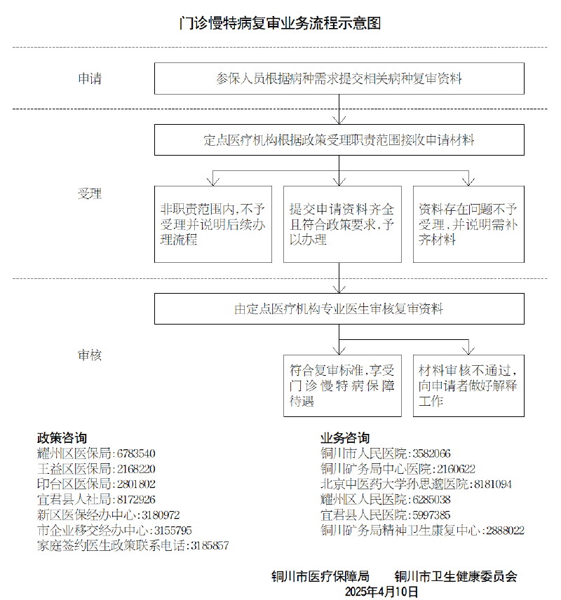 为切实做好2025年基本医疗保险门诊慢特病复审工作,根据铜川市医疗保障局、铜川市财政局、铜川市卫生健康委员会《关于印发铜川市基本医疗保险门诊慢特病管理办法的通知》(铜医保发〔2024〕56号)及《铜川市医疗保障局关于印发基本医疗保险门诊慢特病相关政策标准的通知》(铜医保发〔2024〕57号)文件精神,现就有关事项通告如下: