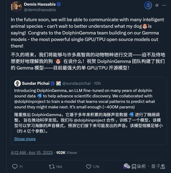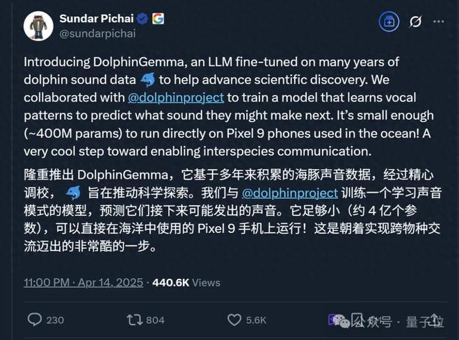 当地时间4月14日(也是世界海豚日),谷歌CEO皮猜激动官宣: