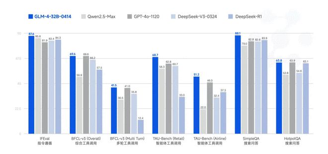 基座模型 GLM-4-32B-0414拥有320亿参数。据悉,其在工程代码、Artifacts 生成、函数调用、搜索问答及报告撰写等任务上均表现出色,部分 Benchmark 指标已接近甚至超越 GPT-4o、DeepSeek-V3-0324(671B)等更大模型的水平。