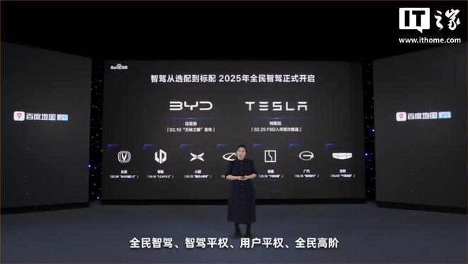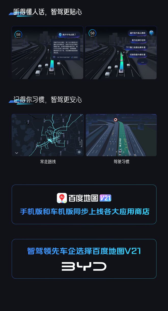 官方介绍称,百度地图 V21 版本是与特斯拉、比亚迪两大车企深度共创后的成果。比亚迪将率先搭载百度地图 V21 版本,其他「智驾领先」车企后续上线。百度地图将为比亚迪天神之眼的部分车型,提供 DiLink 地图导航服务。