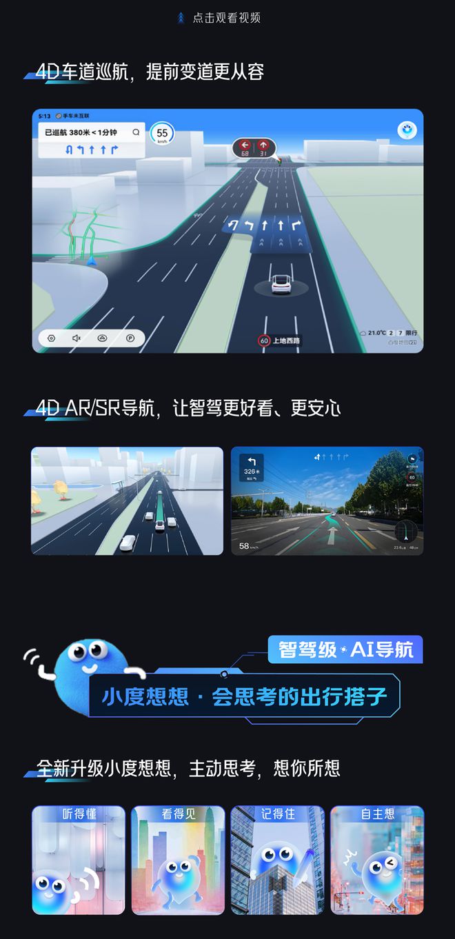 “智驾级 4D 导航”则是“导航与智驾感知全面的融合”,“多一个维度看路”;“智驾级 AI 导航”则是指全新的“小度想想”AI 助手。