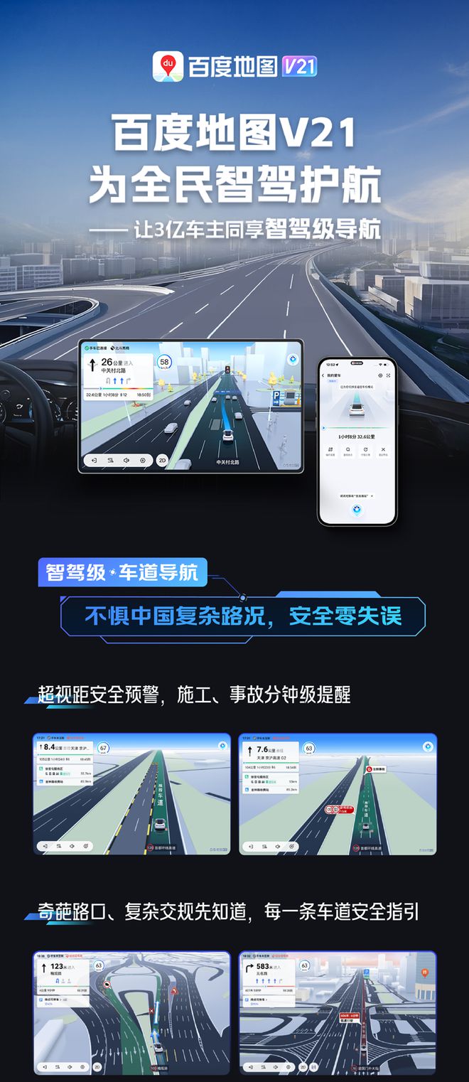 百度地图表示,V21 版本主打“智驾级车道导航”“智驾级车位导航”“智驾级 4D 导航”“智驾级 AI 导航”“智驾级数据”。
