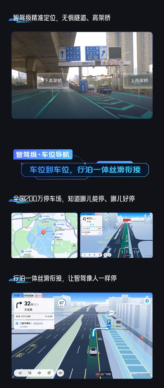其中,“智驾级车道导航”以车道为最小行驶单元,辅助智驾安全决策,号称“让智驾不惧中国复杂交规路况”;“智驾级车位导航”帮助智驾串联最后一公里,从车位到车位“行播出一体”。